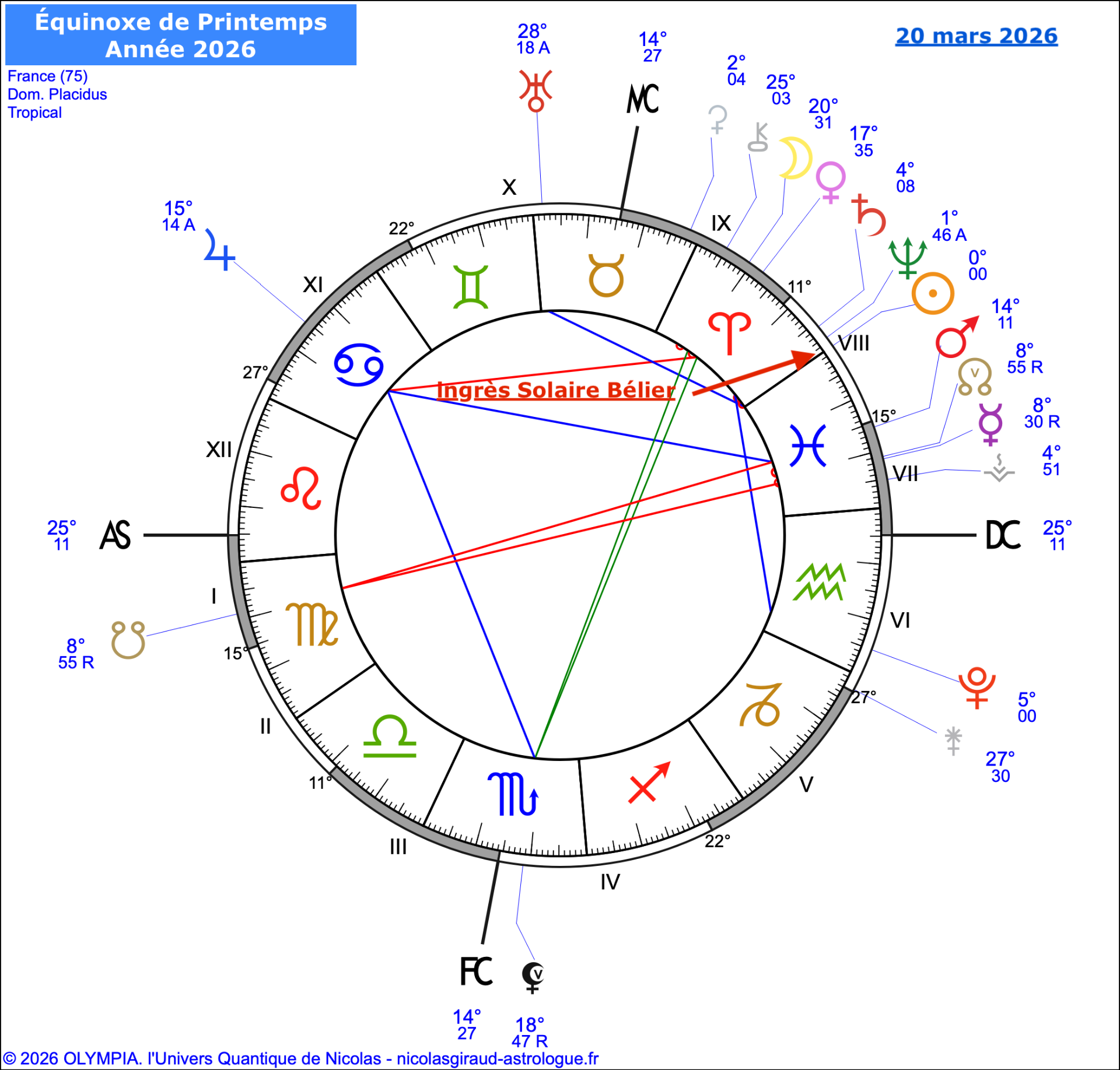Par conséquent, depuis notre position sur terre (géocentrique), c'est une nouvelle année qui s'initie, contrairement à l'année profane (1° janvier-31 décembre), l'étude de la carte du ciel nous donnera les indications pour ce retour solaire du 20 mars 2026 au 19 mars 2027.