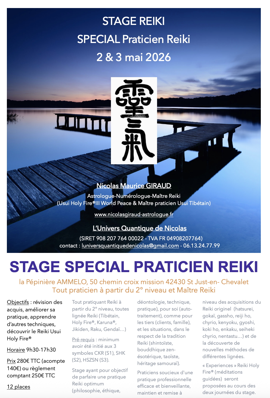 Afin de permettre à tous les autres praticiens Reiki* une pratique optimum, avec une éthique et un professionnalisme qui respectent ce que Mikao USUI nous a légué, d'assurer régulièrement des remises à niveau de vos apprentissages, voir (ou découvrir) d'autres techniques, d'autres pratiques, j'ai planifié un STAGE SPÉCIFIQUE le 2-3 MAI 2026, qui sera l'occasion de faire à la fois une excellente mise à jour de vos compétences, vos acquisitions et de découvrir une "Experience Holy Fire®" ✨