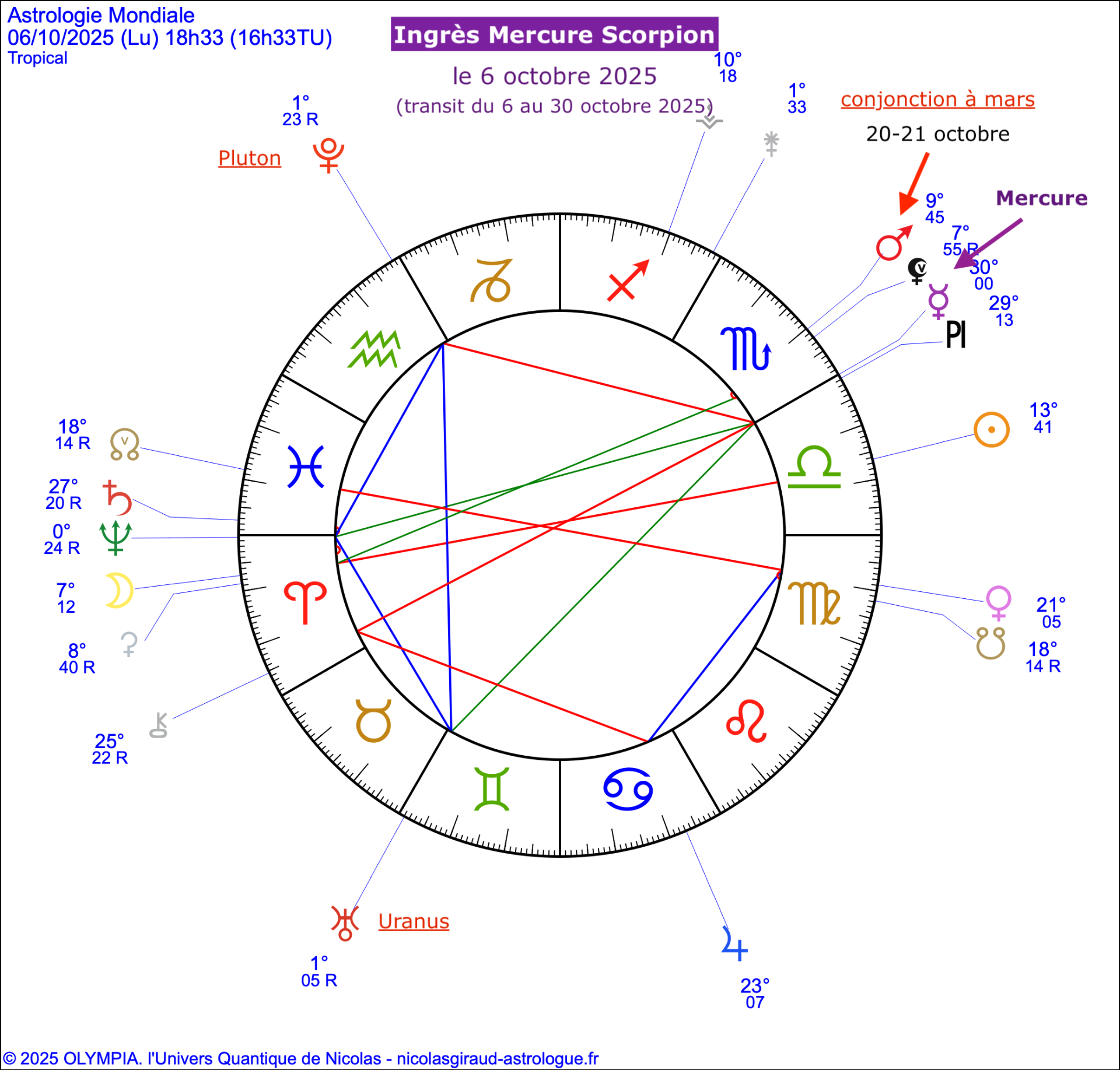 Mercure, la planète des échanges, de l'intellect, de toutes les formes d'expression, de locomotion, de l'organisation, des contacts, mais aussi du commerce et des voleurs (Hermès), fait son entrée en Scorpion demain 6 octobre 2025, transit qui durera tout le mois d'octobre, avant de se rendre en Sagittaire où il sera en débilité planétaire (exil).