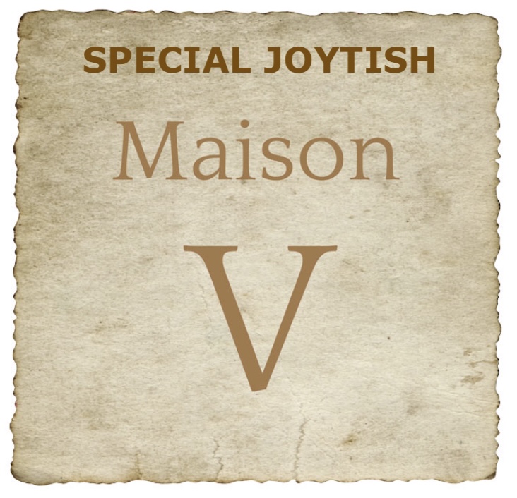 Je vous propose une description de la maison V, qui est une maison bénéfique et trikona, où l'on retrouve naturellement des similitudes avec la matrice occidentale, mais en vous apportant une particularité toute "Joytish", incluant les déités des planètes qui régissent votre Bakhti (dévotion), transportable également avec les Archanges.