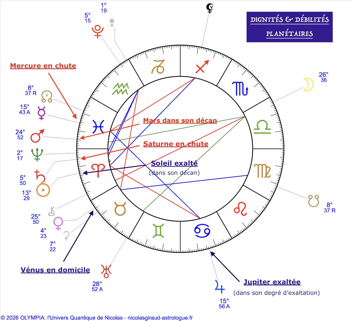 Pour donner un dernier exemple avec la carte jointe, Jupiter exalté en Cancer semble dans les faits favoriser les signe d'eau du Cancer, Scorpion, Poissons et de Terre du Taureau et de la Vierge, c'est vrai, sauf que dans les faits le Cancer est contrarié par un carré solaire en Bélier, et par le trigone reçu de Mercure en Poissons.