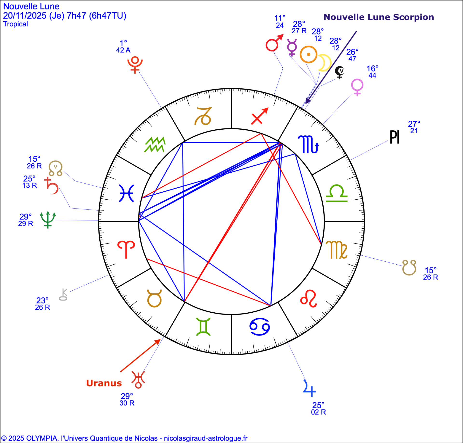 L'aspect de cette NL en Scorpion met aussi en avant la forte opposition Soleil-Uranus, qui dans les faits est active depuis le 11 novembre et sera à son paroxysme le 22 novembre (orbe d'influence de cette opposition appliquante).