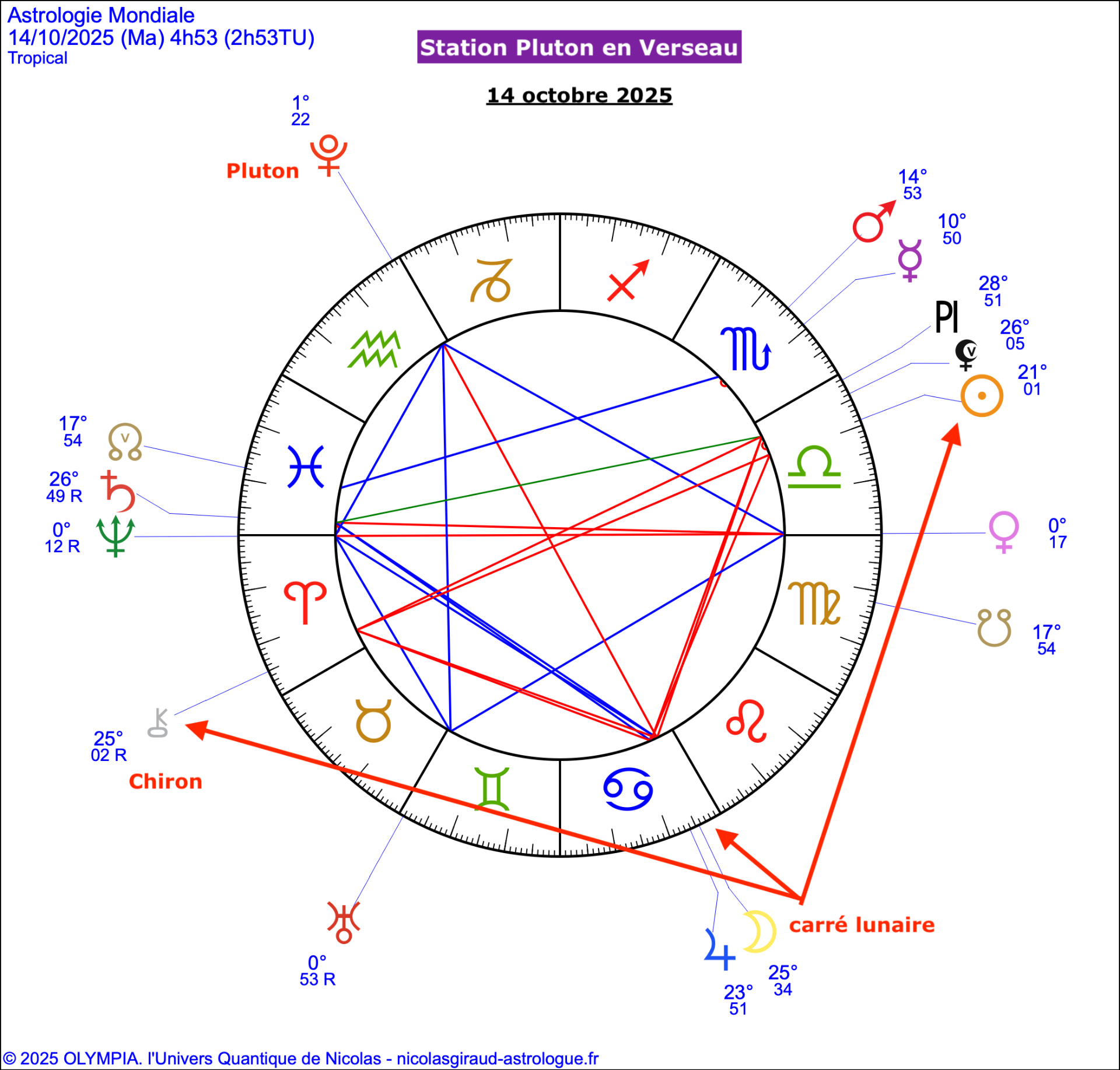La carte du ciel du 14 octobre 2025 demandera une certaine vigilance, la Lune fera opposition à Pluton, les journées du 13 au 15 octobre seront à surveiller, risque majeur de tension, d'explosivité, de rupture, d'autant que la Lune fera carré au Soleil et Chiron.