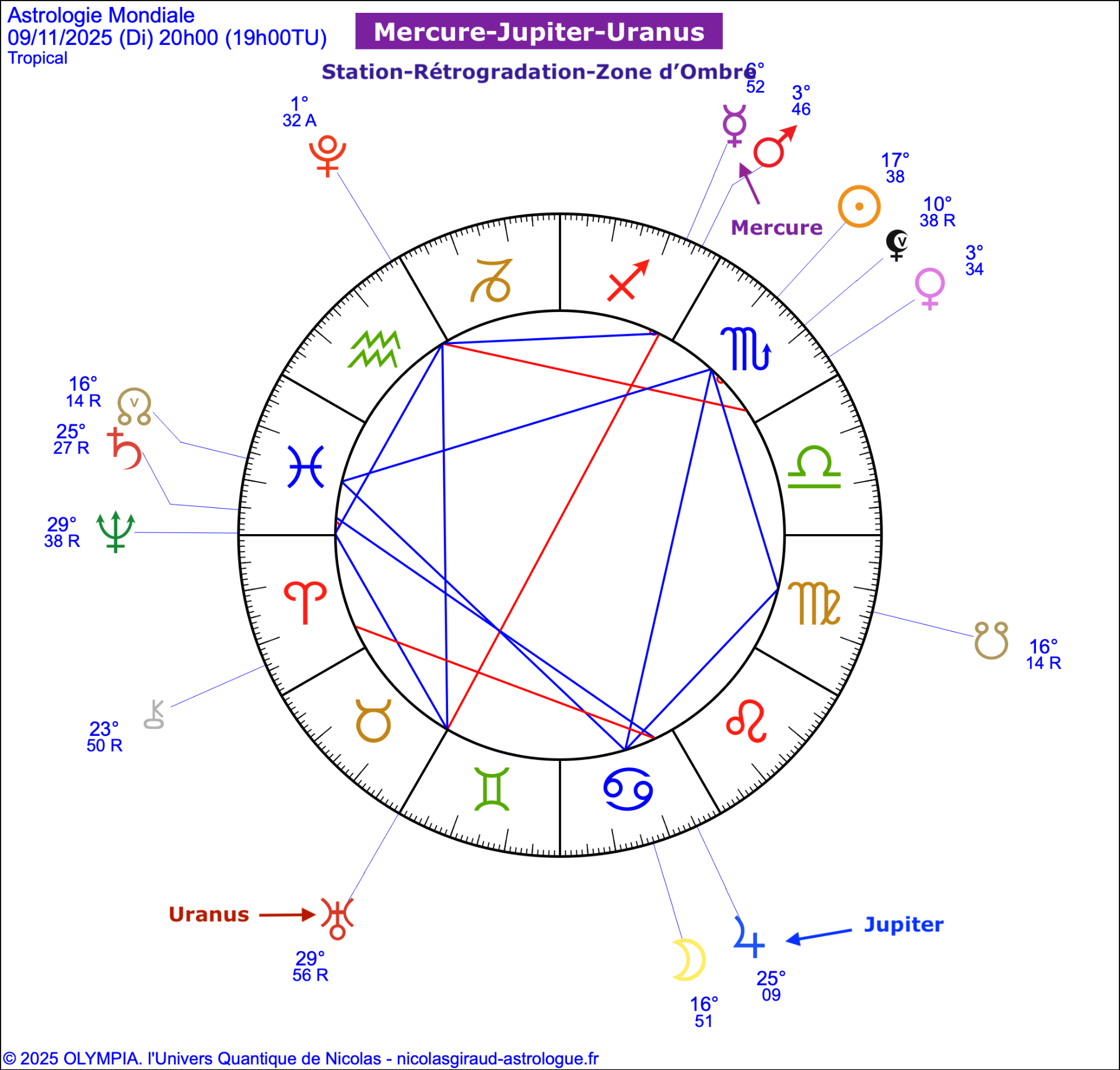 Pour exemple, la zone d'Ombre de Mercure s'est réalisée autour du 21 octobre 2025, correspond à la futur station du Scorpion (20°), Jupiter le 17 août 2025 au 15° du Cancer (futur station), et Uranus le 20 mai 2025, pour la prochaine station du 27° du Taureau ! Incroyable sagesse du ciel et messages à décrypter pour nous accompagner dans nos décisions, et nos réalisations.