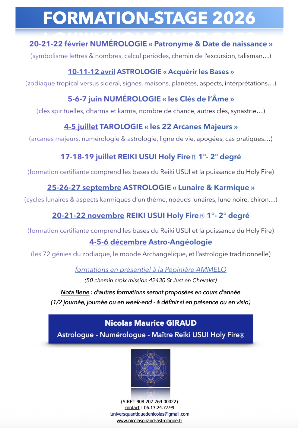 Parce que les connaissances, les savoirs et les compétences doivent pouvoir se partager, Nicolas transmet avec passion et professionnalisme ses enseignements qu'il propose sous forme de sessions, stages à la journée, ou de 2 à 3 journées. Ces formations sont distinctes et complémentaires, elles peuvent être suivies par un large public (débutant, confirmé à professionnel) dans les domaines de l'Astrologie, la Numérologie, ou encore de modules spécifiques en Tarologie, (les 22 arcanes) et Angéologie (les 72 génies), alliant les nombres, les planètes et le zodiaque en ce qui les concerne.
