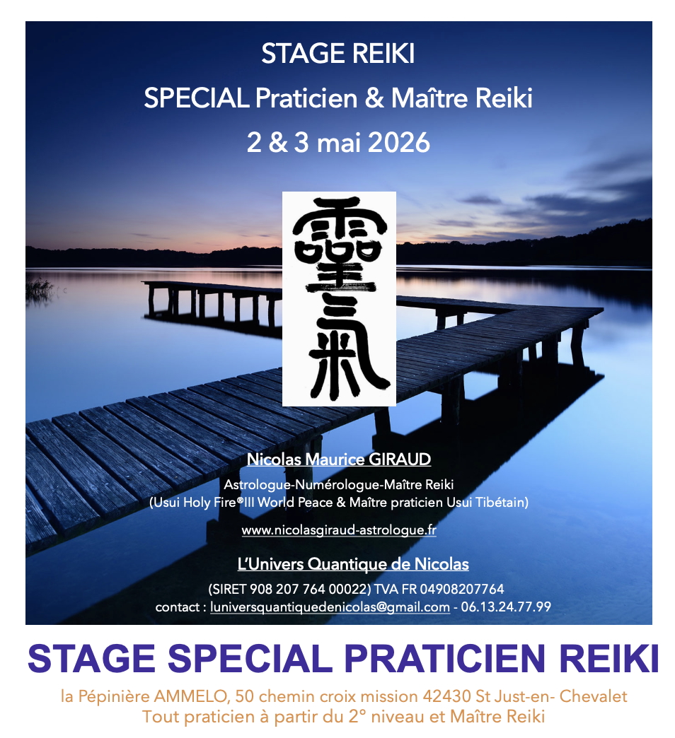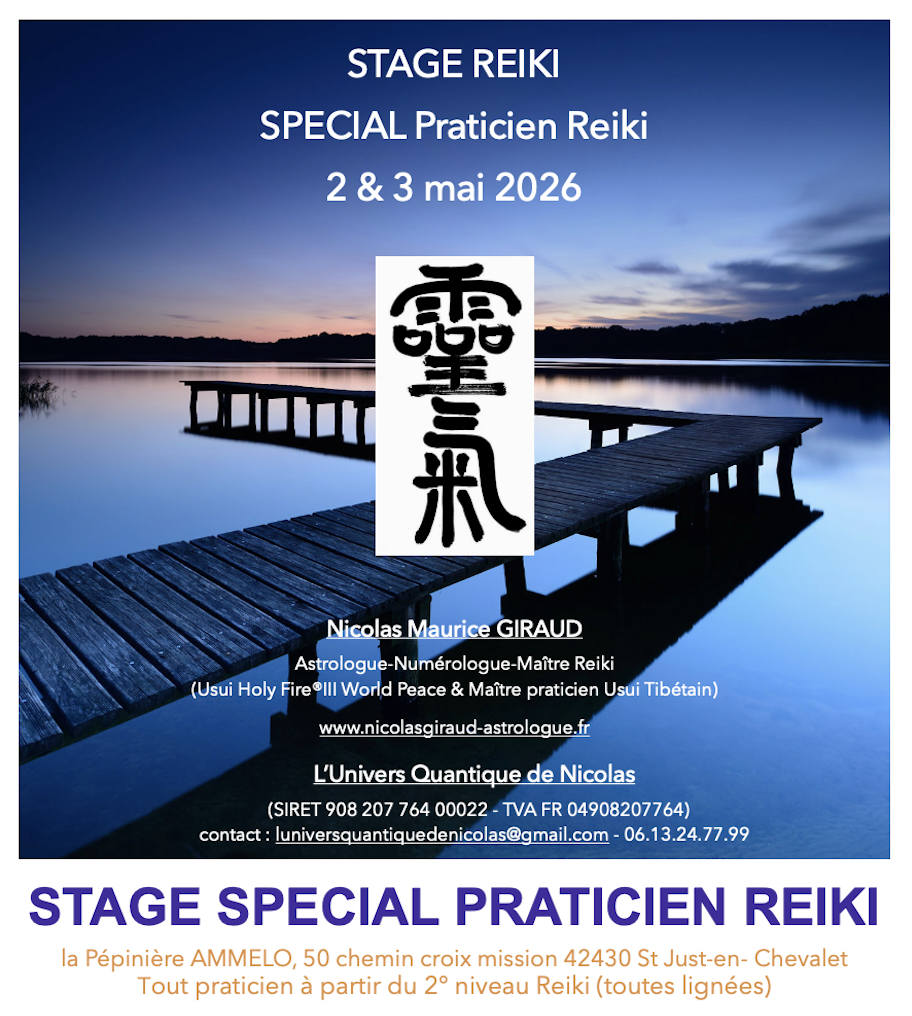 Stage UNIQUE pour tout praticien soucieux d'une pratique Reiki professionnelle efficace, éthique et bienveillante, du maintien et la remise à niveau des acquisitions (spirituelles, énergétiques, et techniques), de la réappropriation du Reiki originel (Reiki Usui Gakkaï), de la découverte, et l'enrichissement de nouvelles pratiques issue de différentes lignées, et particulièrement du Reiki Holy Fire®.