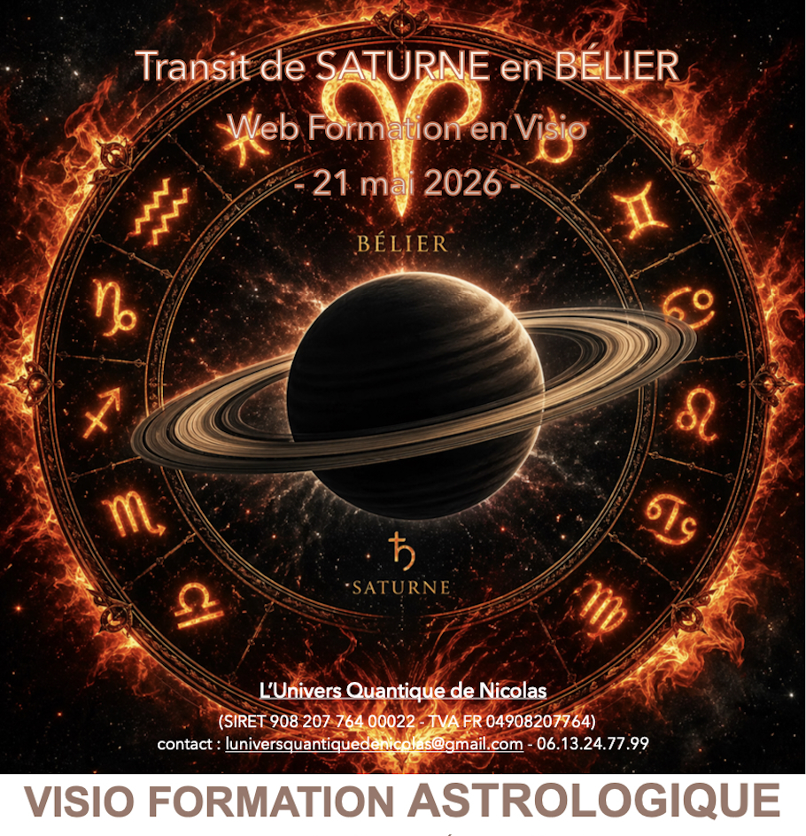 visioconférence du 21 mai 2026 (17h30-20h00) sur la présentation du transit majeur de Saturne en Bélier (2026-2028), influence de ce transit pour le monde sociétal, et analyse dans le thème natal. Nombreux points abordés : dignités, débilités, maîtrise des signes, influence des dispositeurs, signes cardinaux impactés, dynamiques des planètes et maisons en natal, révolution, cycles climatériques de Saturne, la grande conjonction Saturne-Neptune en Bélier, particularité d'un thème diurne, nocturne pour le Bélier, la Balance, station et rétrogradation de Saturne sur la période. Identifier le rapport 6/8 - 8/6 dans le transit de Saturne en natal...