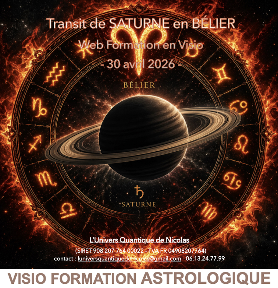 visioconférence du 30 avril 2026 (17h30-20h00) sur la présentation du transit majeur de Saturne en Bélier (2026-2028), influence de ce transit pour le monde sociétal, et analyse dans le thème natal. Nombreux points abordés : dignités, débilités, maîtrise des signes, influence des dispositeurs, signes cardinaux impactés, dynamiques des planètes et maisons en natal, révolution, cycles climatériques de Saturne, la grande conjonction Saturne-Neptune en Bélier, particularité d'un thème diurne, nocturne pour le Bélier, la Balance, station et rétrogradation de Saturne sur la période. Identifier le rapport 6/8 - 8/6 dans le transit de Saturne en natal...